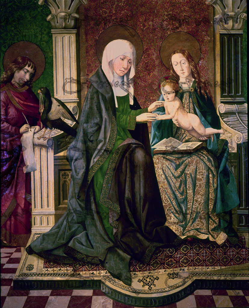 MADRID MUSEO LAZARO GALDIANO – COLECCION SANTA ANA TRIPLE CON SAN JUAN EVANGELISTAS – LA VIRGEN CON EL NIÑO SAN JUAN EVANGELISTA Y SANTA ANA – SIGLO XV/XVI – O/T – 137 x 111 cm obra de MAESTRO DE SINOBAS